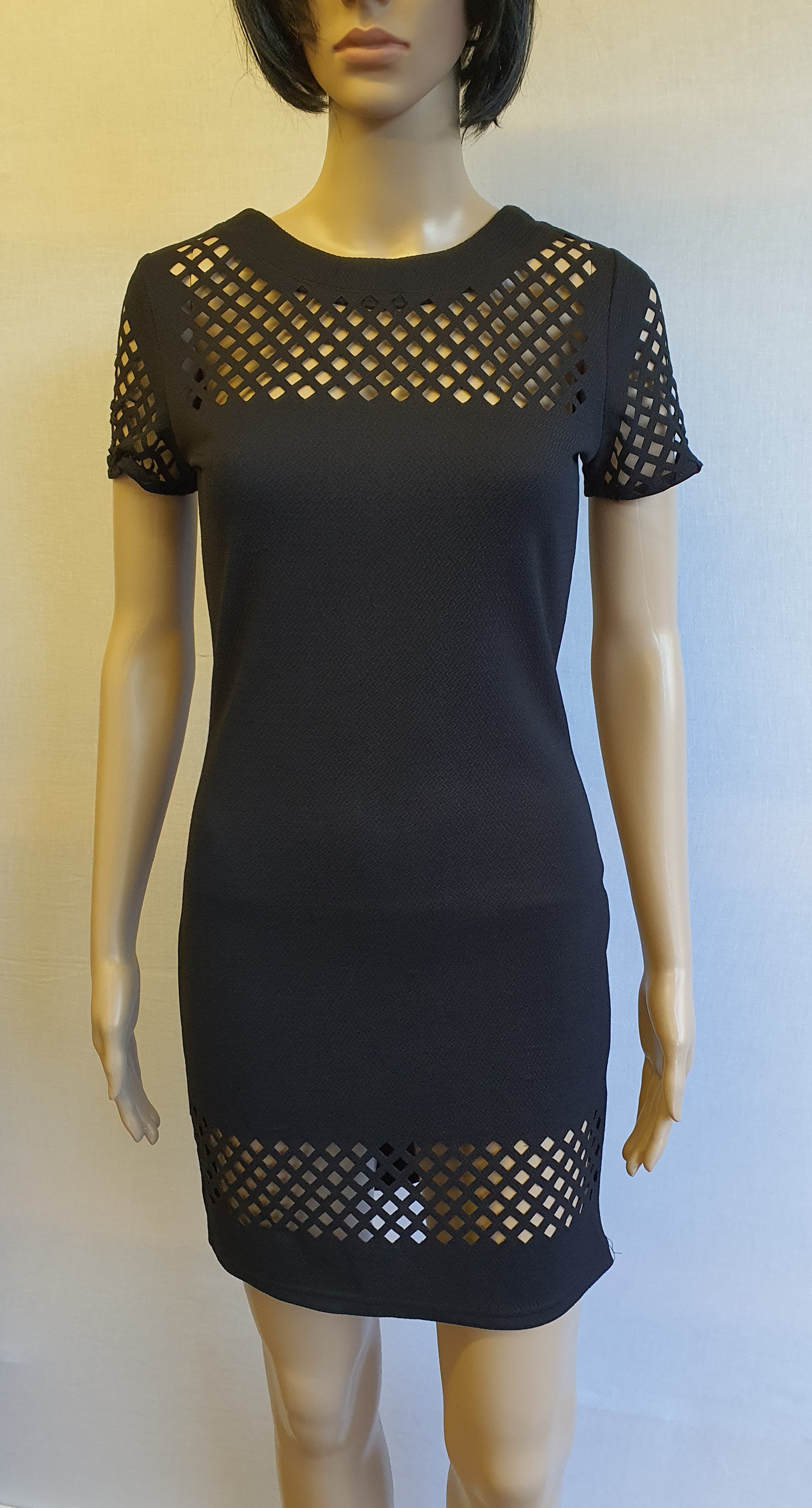 Here we have a brand new Black Dress with a mesh design to the top and bottom of the dress in Size UK 8 from Blue Vanilla.