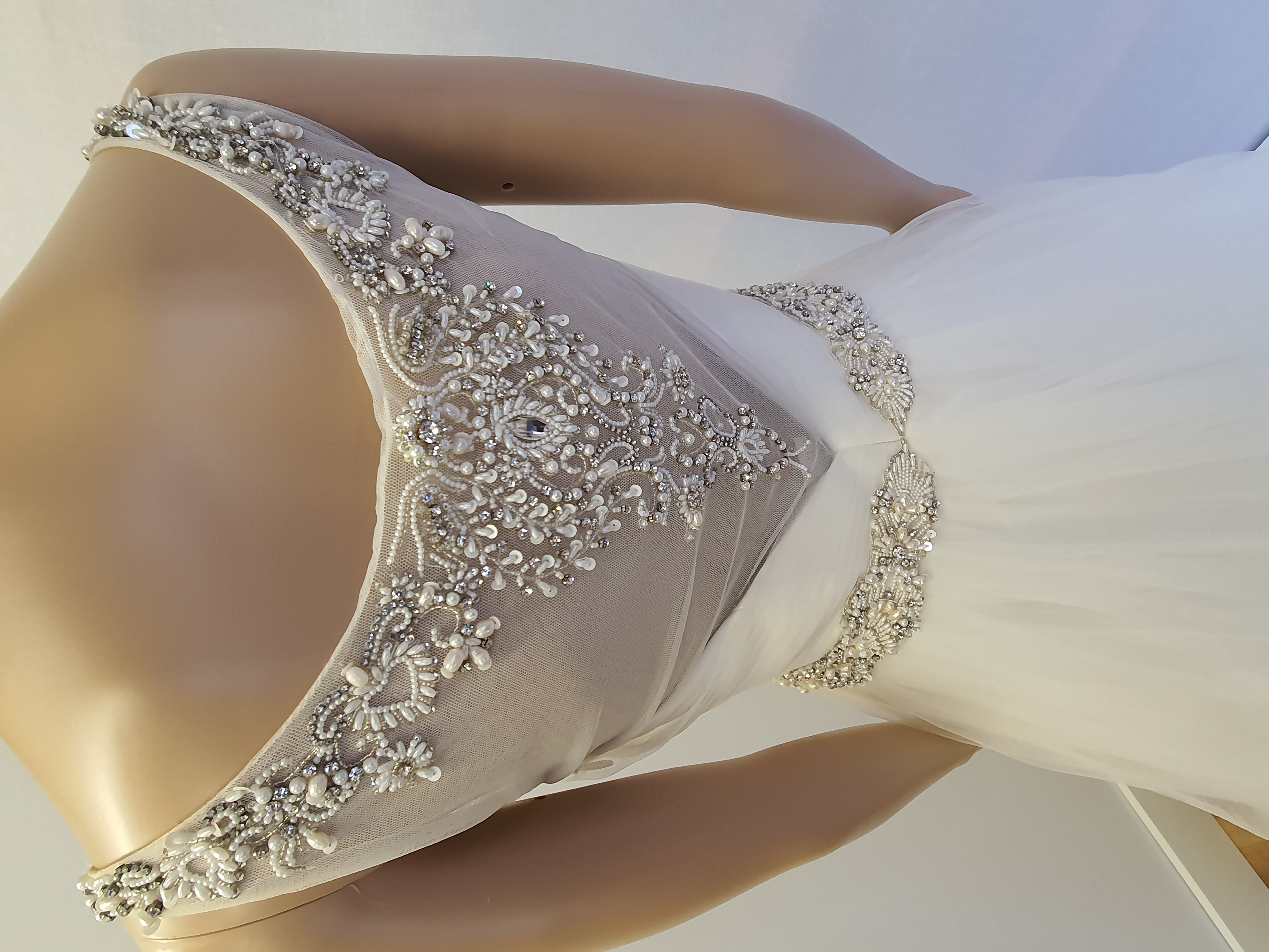 This truly beautiful eye catching Wedding Dress is enriched with a combination of Beads, Pearls and Diamantes to the Front, Waist and Back that continously sparkling and make this dress both elegant and visually beautiful.